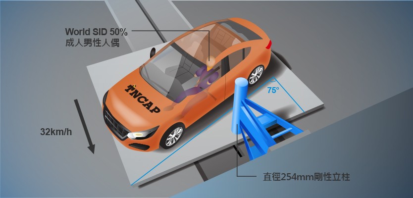 側方立柱撞擊試驗為模擬車輛因打滑失控導致車輛側面撞至路旁的電線桿、路樹或路燈柱等剛性物體的事故型態,且因該事故型態通常較為嚴重