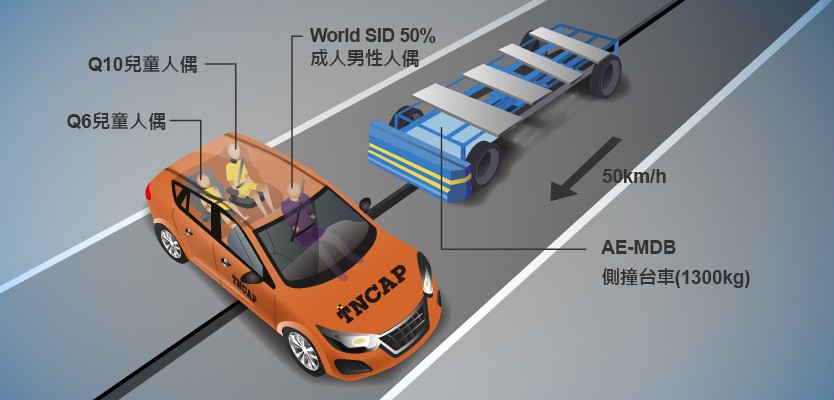 側方撞擊試驗為模擬車輛行經十字路口時遭受側向來車撞擊的事故型態,相較於前方碰撞,由於車輛側方所能提供的潰縮區域遠遠小於車輛前方